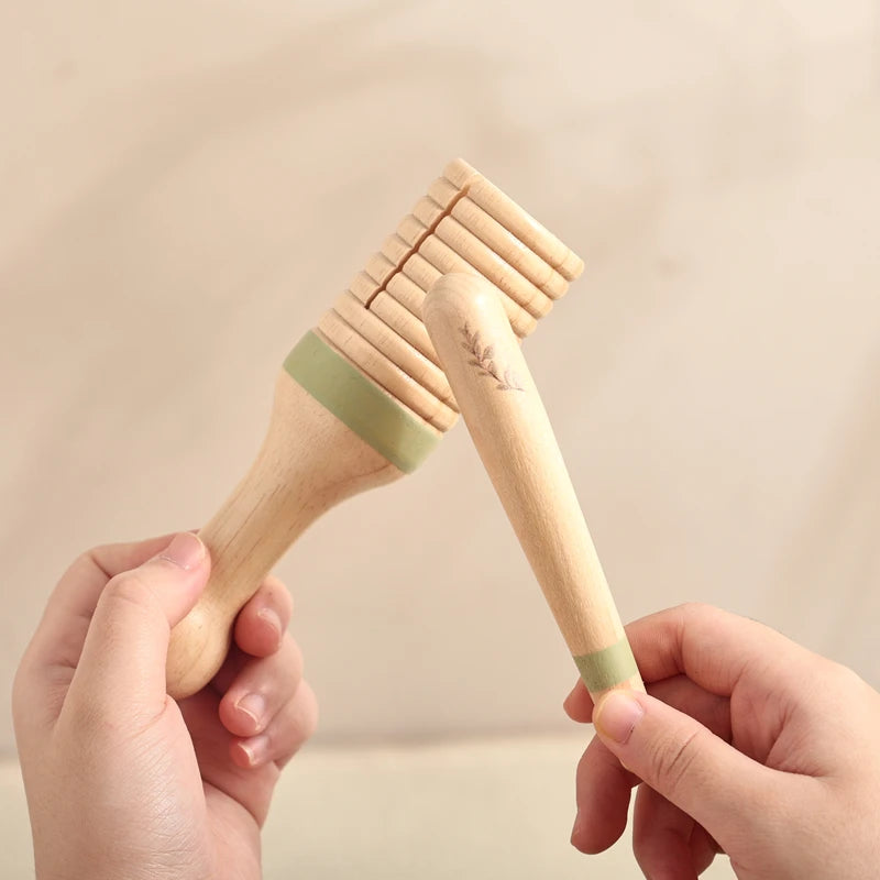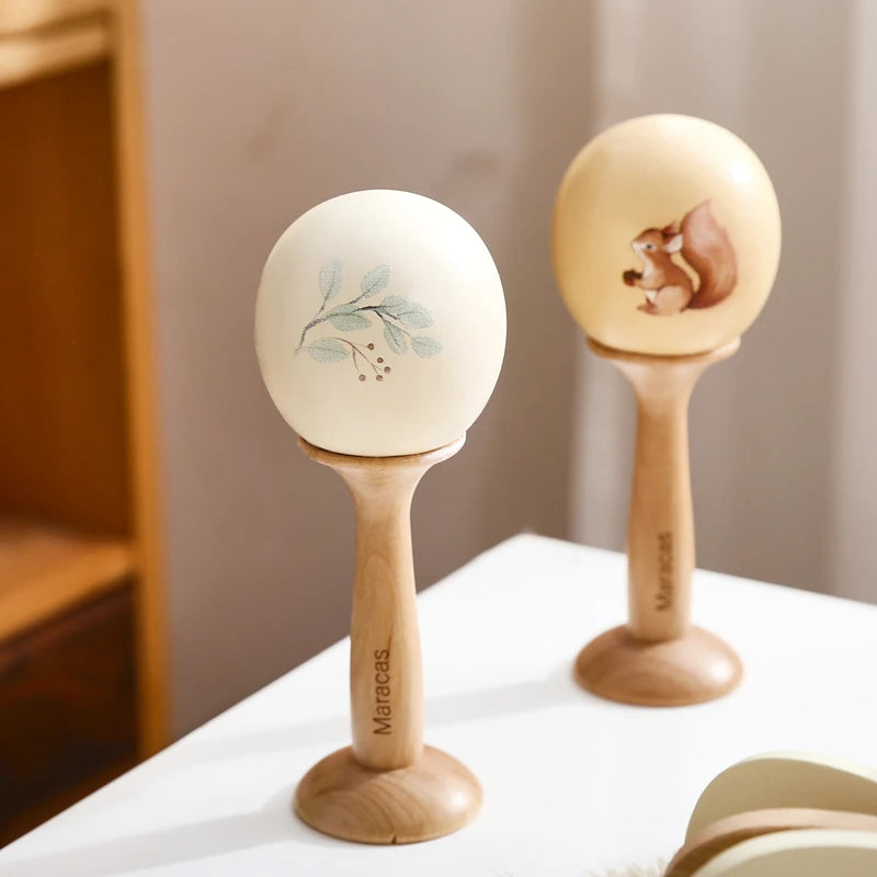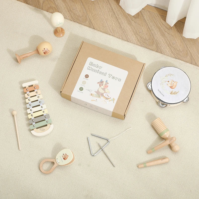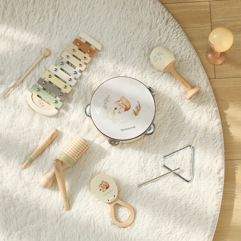 Instrumentos musicais de madeira com ilustrações de esquilo, criado para despertar o amor pela música desde os primeiros meses. Ideal para estimular os sentidos, promover a criatividade e reforçar os laços familiares através da música.