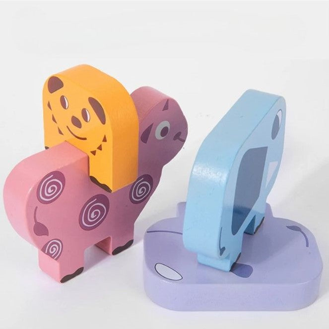 10 Animais Divertidos: Cada peça representa um animal com formas distintas para empilhar de diferentes formas.