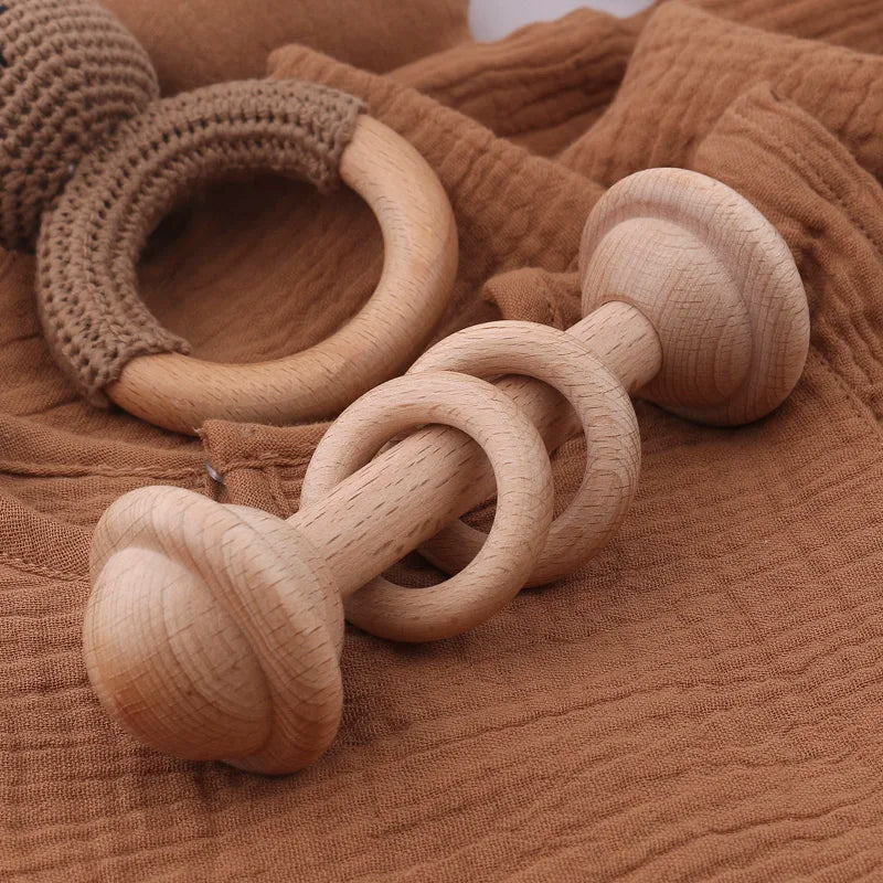 Materiais naturais e seguros: algodão macio e madeira suave.