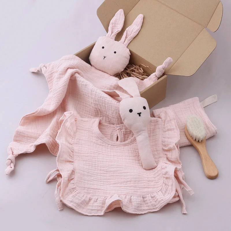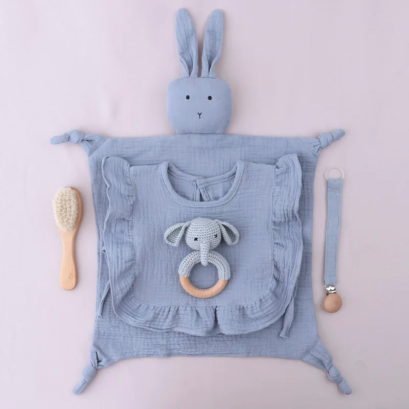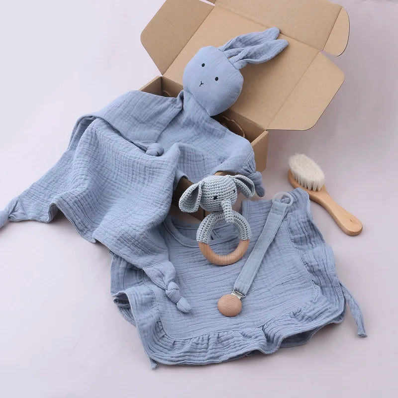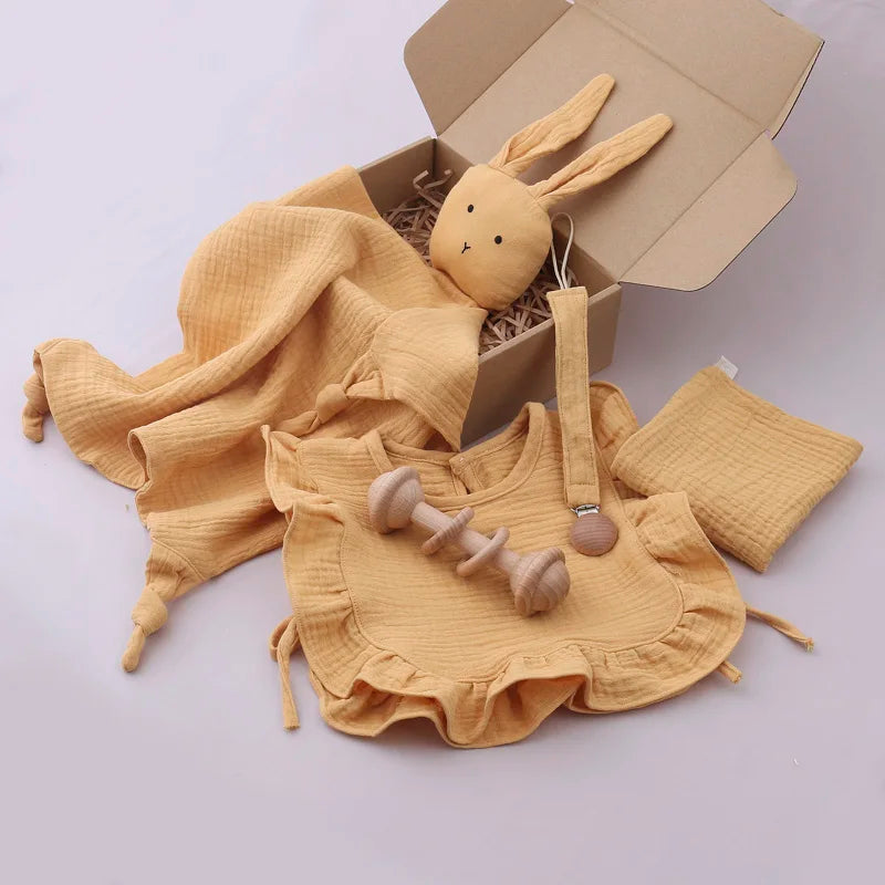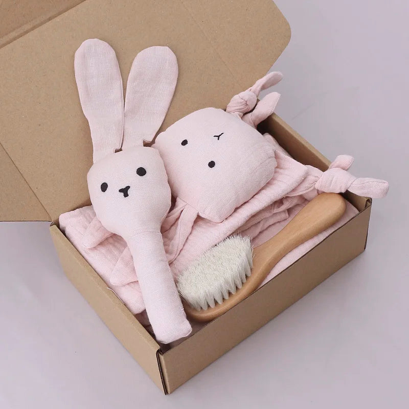 A Box My Little Nest – foi pensada para envolver o teu bebé num ninho de conforto, suavidade e encanto. Com uma paleta neutra e elegante, este kit inclui tudo o que é essencial nos primeiros dias: babete com folhos, doudou, mordedor artesanal, escova de cerdas naturais e muselina.