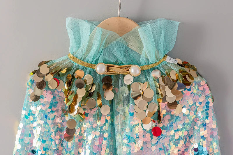 Capa mágica azul com lantejoulas – fantasia encantada para meninas