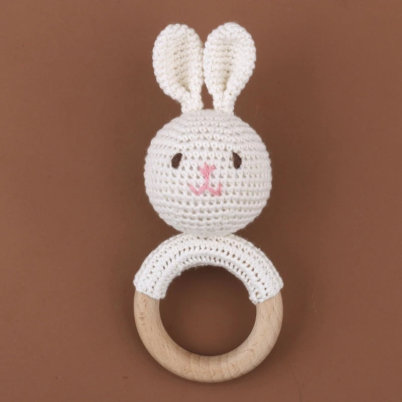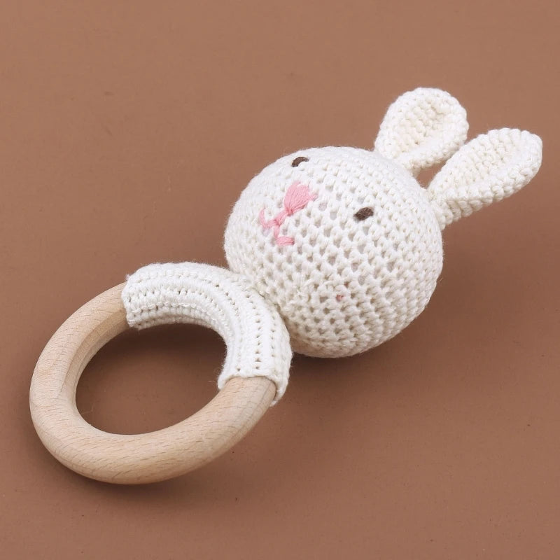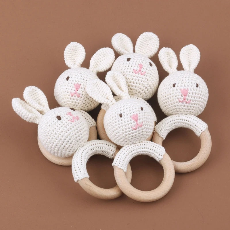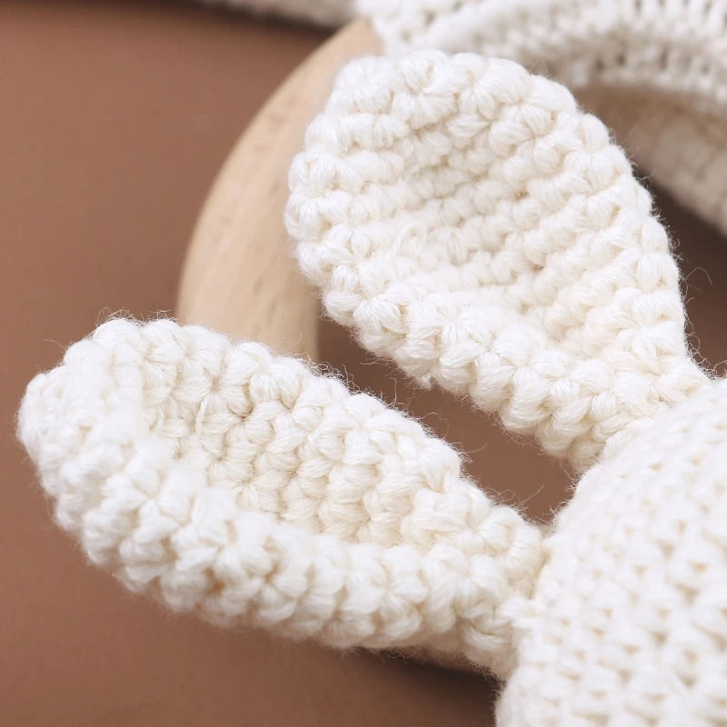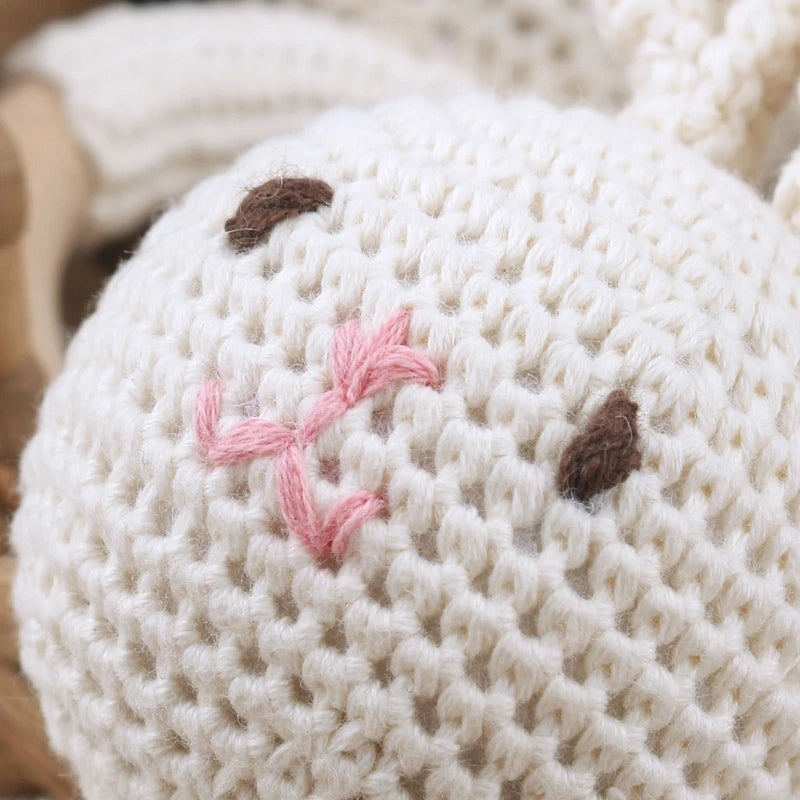 Chocalho de Coelho em Croché com Pega de Madeira – Estímulo Natural para Bebés