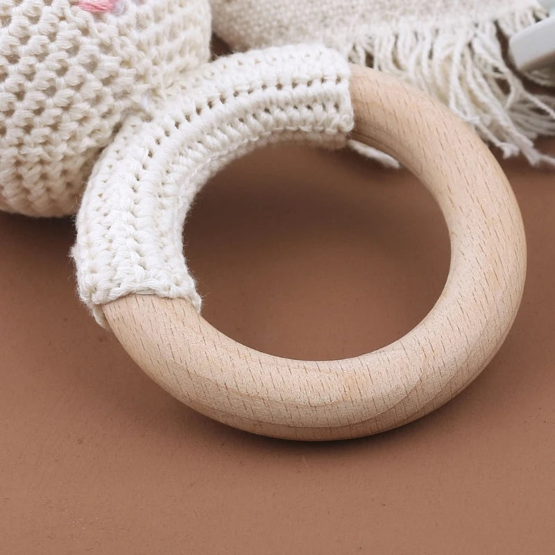 Materiais Naturais: Cabeça em algodão croché feito à mão e aro em madeira suave, ideal para mãos pequeninas.