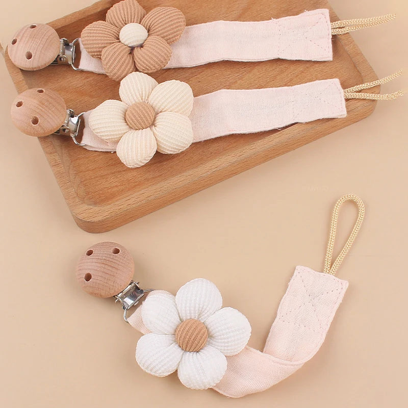 Este delicado clip de chupeta em forma de flor combina elegância com funcionalidade. Fabricado em madeira natural e tecido suave, é ideal para manter a chupeta sempre à mão e longe do chão, com um design encantador que capta a atenção dos bebés. Disponível em tons neutros, adapta-se a qualquer enxoval.