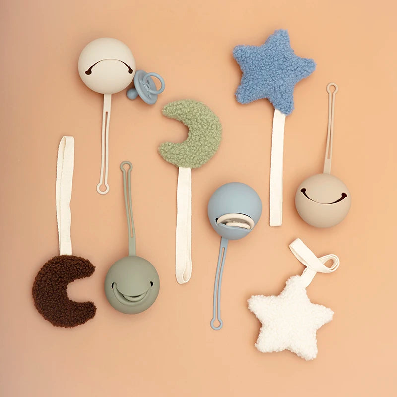 Torne cada momento mais doce com este clipe de chupeta em forma de lua, perfeito para acompanhar o bebé desde os primeiros dias. Feito em tecido sherpa ultra macio, transmite uma sensação de conforto e tranquilidade, enquanto mantém a chupeta sempre por perto. Um acessório funcional com um toque encantador.