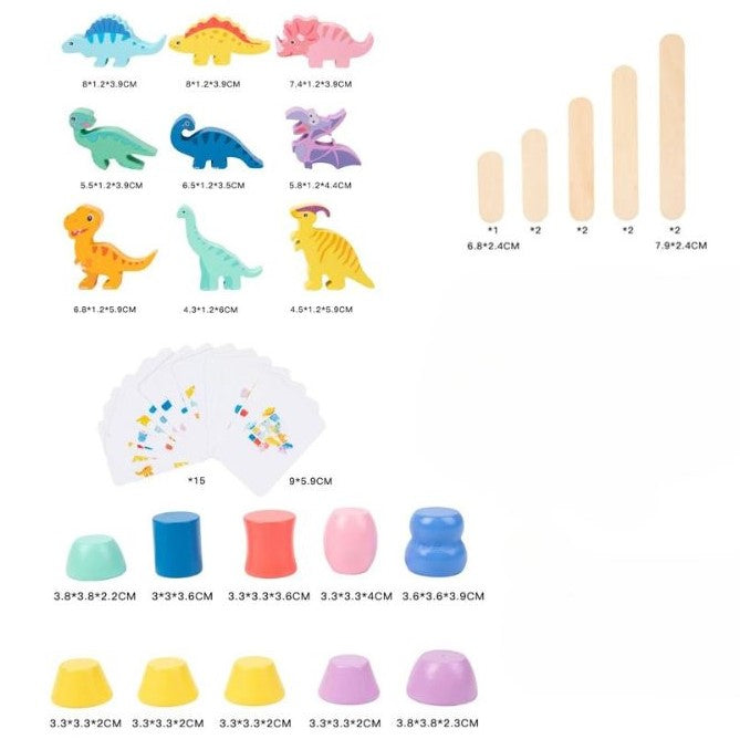 Design educativo: Jogo de empilhamento com peças em madeira coloridas, copos, barras e figuras de dinossauros.