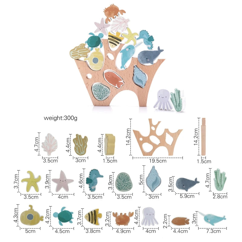 Inclui 18 peças: animais marinhos variados + base de madeira para empilhar