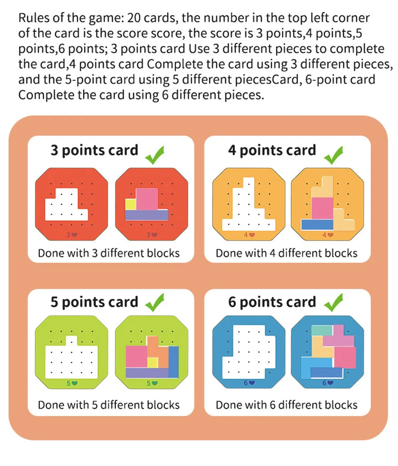 4 níveis de dificuldade com cartas de 3 a 6 pontos (quanto mais difícil, mais peças são necessárias)