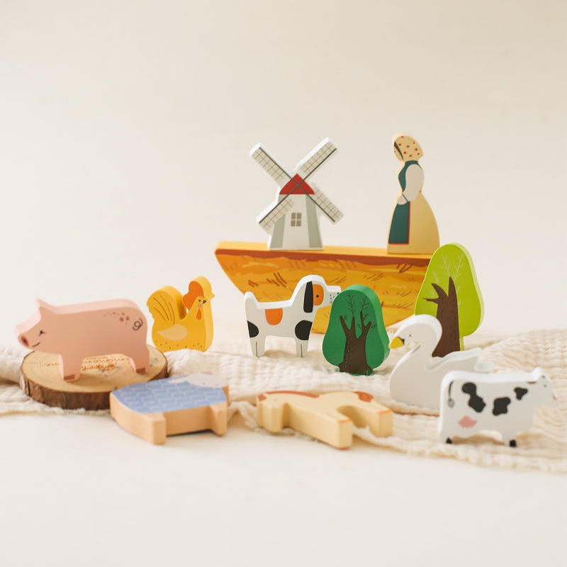 Inclui: Conjunto de blocos de madeira com temática de animais e quinta