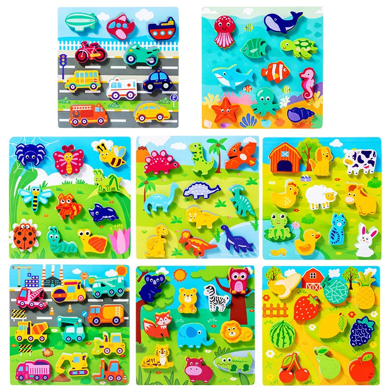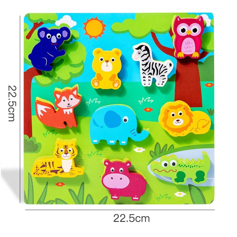 Quebra-cabeças 3D em madeira com velcro – Animais, frutas, meios de transporte e muito mais!
